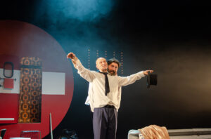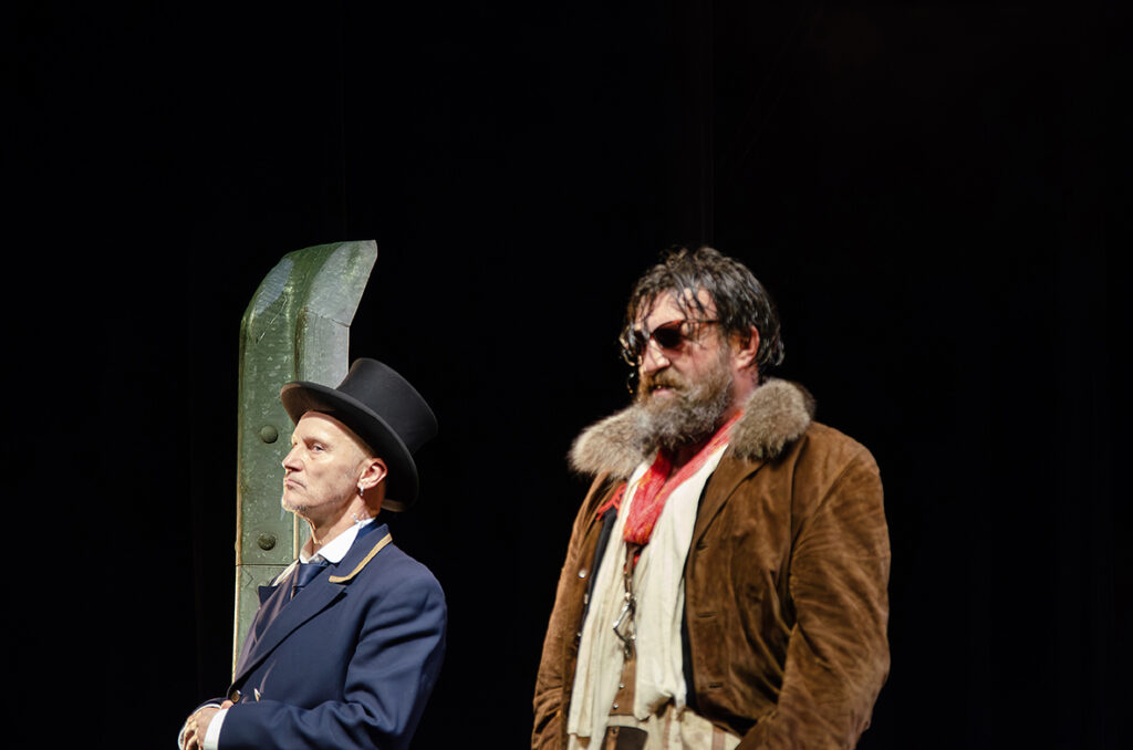 Pas d’artifice ni de fausse pudeur, juste le texte et rien que le texte. Il n’en faut pas plus. Pour enfiler ces costumes-là qui ne sont pas n’importe lesquels, nous mettrons face à face sur scène deux artistes équilibristes et funambules, Vincent Ozanon, le français un peu suisse et Thierry Hellin, le belge bien belge. Deux fortes gueules, tous deux maladivement amoureux des mots, de ceux-là qui sont gourmands et gouleyants ! Un bon gros cabot, véritable Mastiff qui s’amuse de ses bajoues baveuses et de ses oreilles pendantes ; et un grand escogriffe, maigre et desséché qui se drape de sa dignité pour masquer maladroitement ses blessures. Les deux acteurs tiennent-là un beau gros morceau d’os et ne doutons pas qu’ils s’amuseront à nous mordiller voire à nous mordre, là où ça fait mal.
