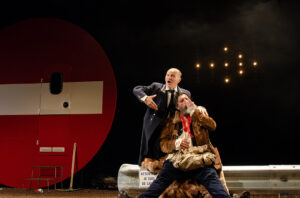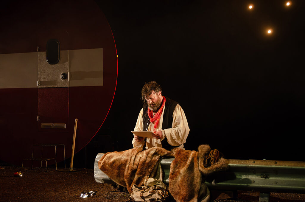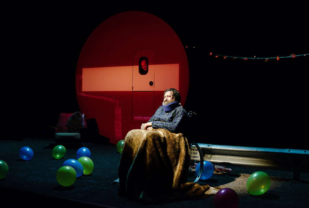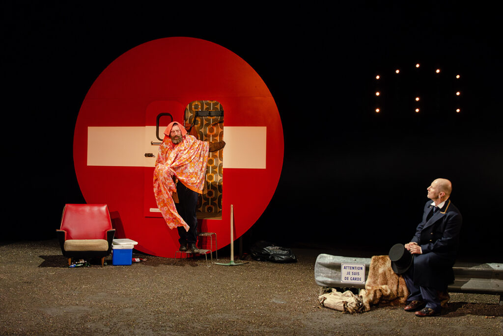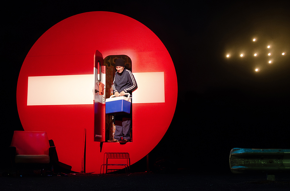 Férocité du texte pour ne pas laisser indifférent et pousser à l’introspection. Un écrit aux allures de critiques sociales débité par des personnages au langage coruscant, grandes gueules aux logorrhées métaphysiques, gorgées de bon sens populaire. Aussi, car l’essentiel de la relation réside dans leurs joutes verbales, j’ai choisi de ne pas encombrer le plateau, un espace épuré, une bande étroite de terrain vague au bord d’une autoroute bruyante. Un espace indéfini coincé entre la balustrade métallique et une palissade décatie où s’affiche ironiquement une publicité pour pompe à essence, un improbable chien à 5 pattes, vestige d’une célèbre marque. Une porte surélevée s’ouvrant sur un semblant d’intérieur de caravane recelant ce qu’il reste d’une vie en déroute, en suspension, une itinérance à l’arrêt avec juste le nécessaire : un fauteuil fatigué, une bassine pour la toilette, un butagaz pour la pitance, un parasol et des ballons de baudruche pour les beaux jours, quand ils viendront…
