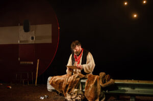 Tragédie clownesque donc, aux allures d’histoire d’en rire qui, ne nous y trompons pas, raconte bien davantage. L’homme hurle, aboie et grogne face à ce chien qui ruse et louvoie. Tout est bon à critiques : la pollution, la misère, les politiques, la politique, les intellos, les assistantes sociales… la vie. C’est aussi l’histoire de deux destins : celle d’un chien canaille qui adore les coups fourrés et celle d’un triste maître qui ronchonne… une histoire de paumés qui ne s’entendent pas, tout en ne sachant plus se passer l’un de l’autre.