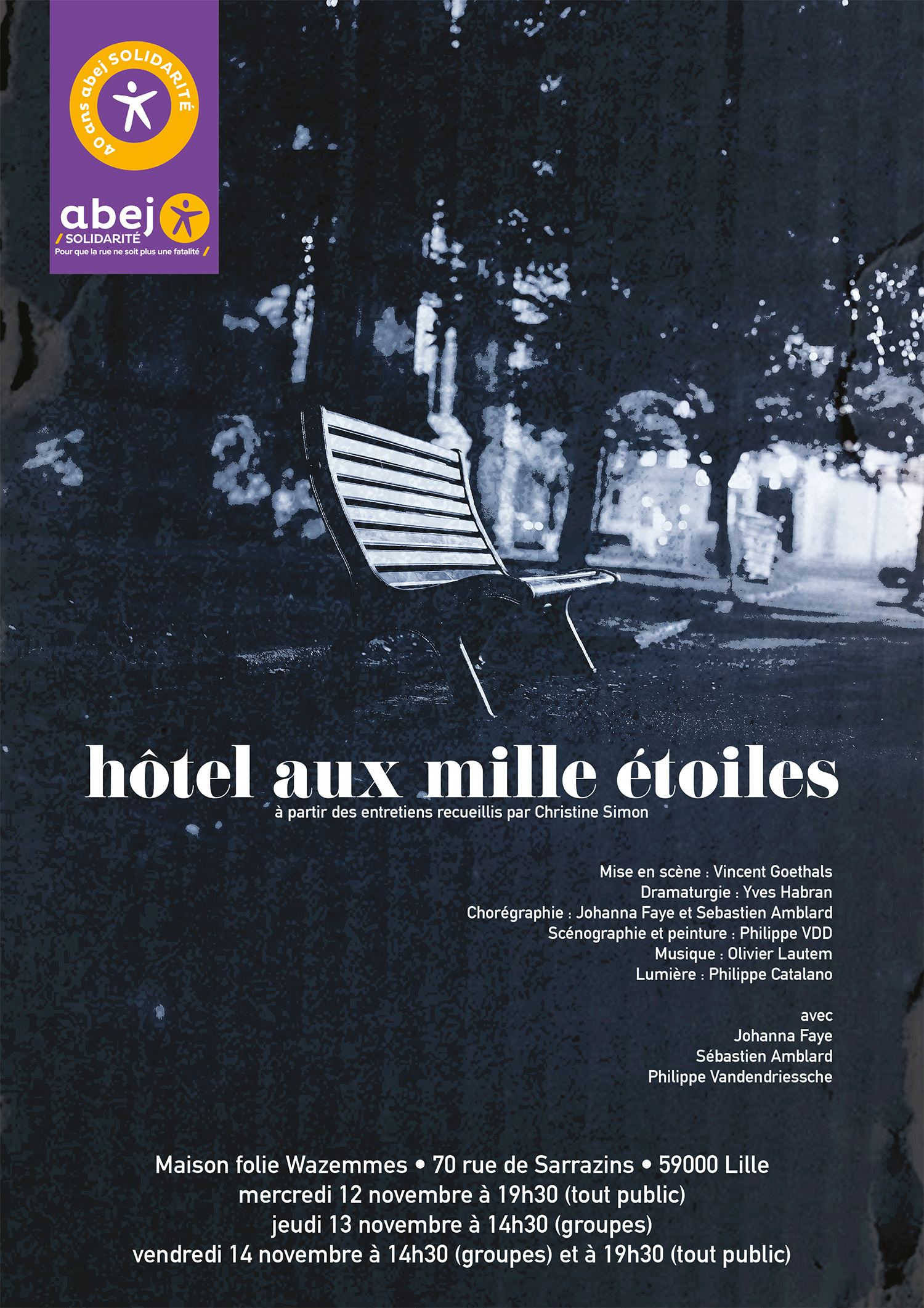 Ce projet a pour vocation d’interroger le regard que nous portons sur les personnes sans domicile. Chaque présentation est suivie d’un temps d’échanges avec l’équipe de création.